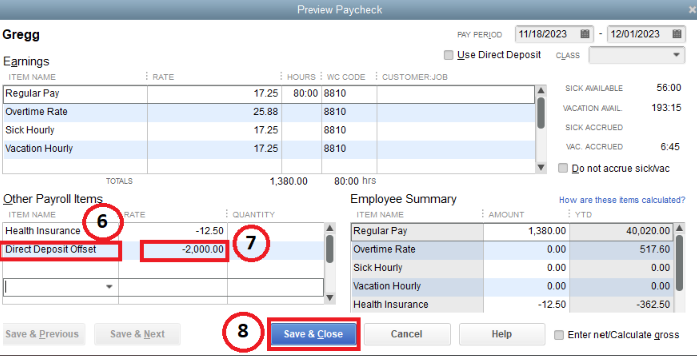 Since you mentioned that you recreated Joseph's paycheck, you're on the right track and correct about unchecking the Direct Deposit. To proceed, you'll need to enter a negative amount for the Direct Deposit Offset item. Ensure that it has an equal amount to the net amount of the paycheck. After making some changes within the paycheck, you can now Save & Close.