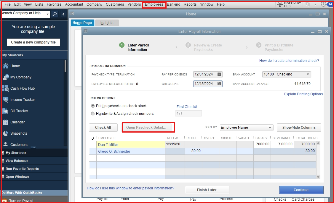 1. From the Employees menu, select Pay Employees and then Termination Check.