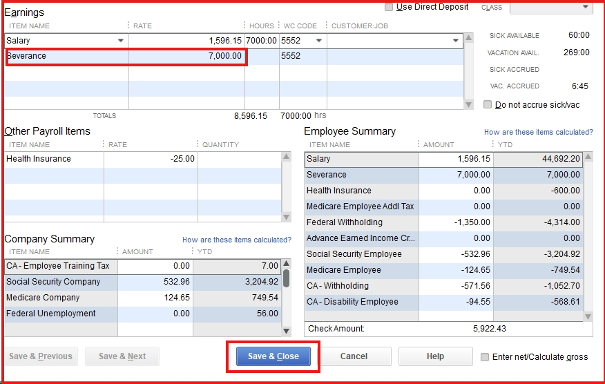 6. To add a severance amount to an employee’s check under Earnings add the amount and enter. Ensure that the amount you enter is correct. Then Save & Close.