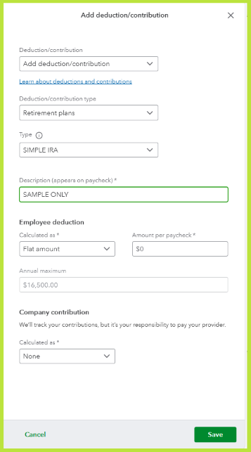 Additionally, you'll have the option to modify the amount of your contribution when processing payroll. For more details, please refer to this article: Set up or change a retirement plan.