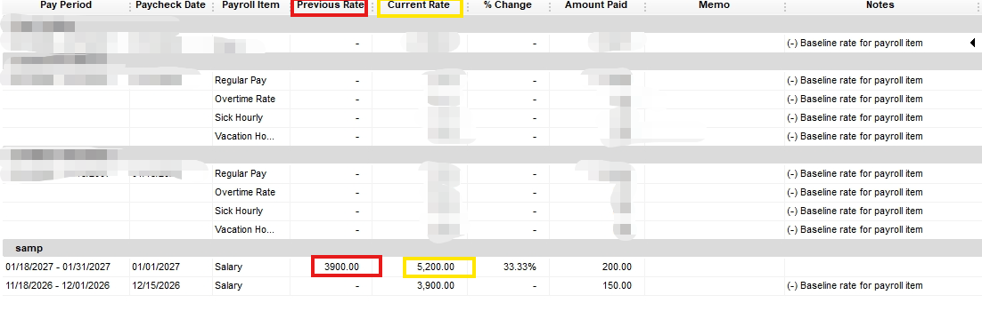 This report displays the employee's name, the pay item that was changed, the old rate, the new rate, and the date the modification was made.