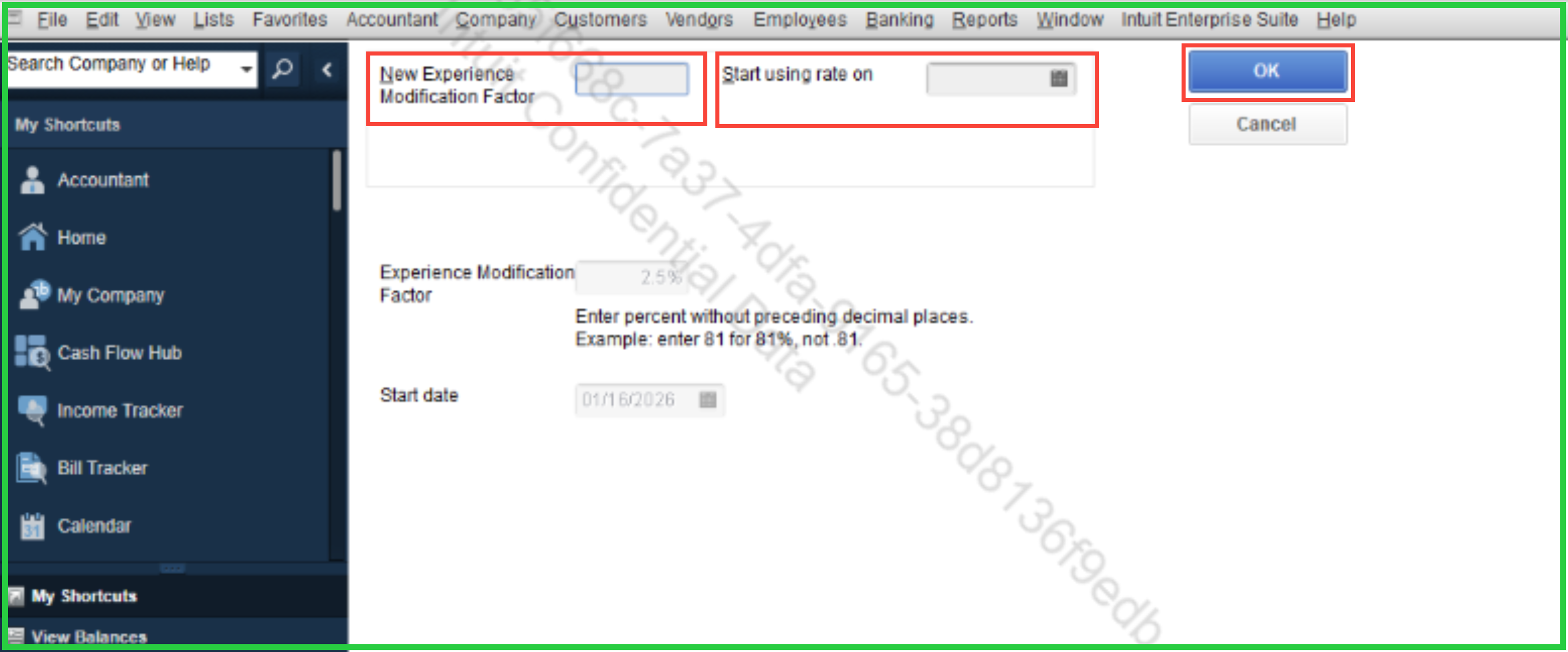 To reflect the change, all you need to do is enter the new rate in the New Experience Modification Factor field, input the effective date into the Start Using Rate On field, and click OK. That should save the changes and apply the new rate moving forward.