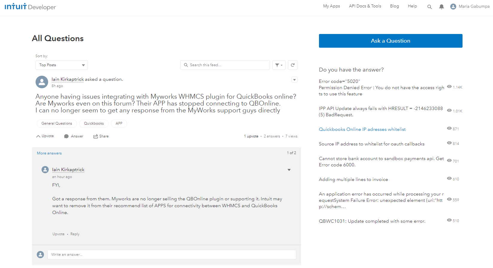 You can go to our Intuit Developer's website and ask questions from there. To do this, you'll need to log in with your existing Intuit Developer Account or Create a new one.