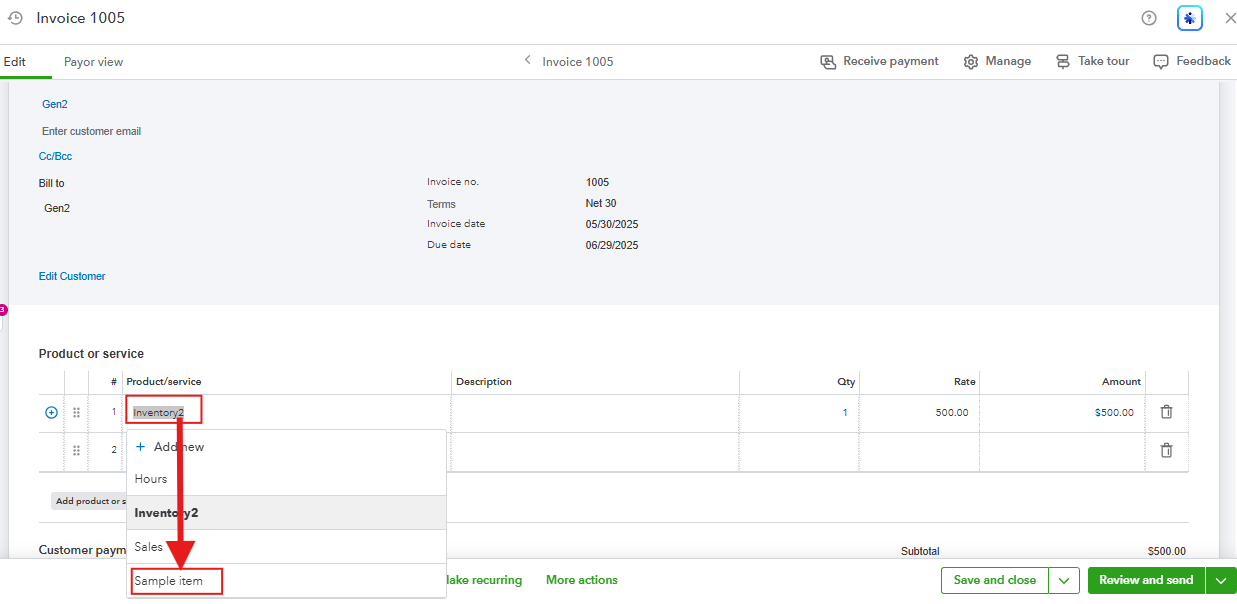 After creating a bill, edit the invoices from 05/30/2025 and replace the old service/non-inventory items with this new inventory item. Here's how: