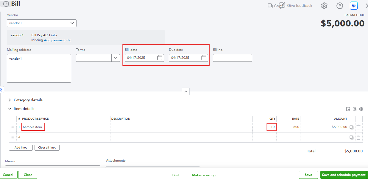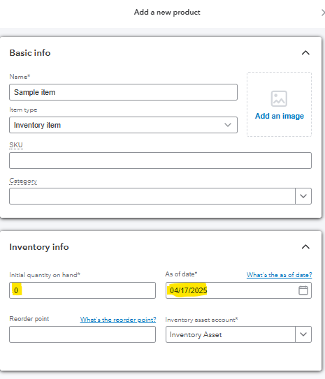 To fix this, you'll need to create a new inventory item dated 04/17/2025, set the quantity to 0. This way, you can enter a bill of your desired quantity, and it will be added to the quantity of the newly added inventory item.