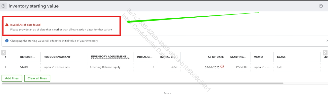 The error occurs because the inventory start date you entered (01/31/2026) is after the dates on the invoices (starting 05/30/2025) where you used those items. QuickBooks won't allow you to record a purchase or sale for an item before its official As-of-date.