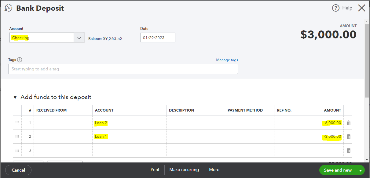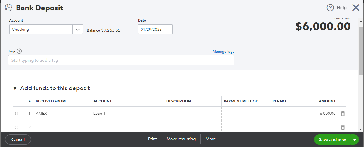 Step 5. Create a deposit to record the amount you received, but we'll deduct the payment (offset) to repay "Loan 1".