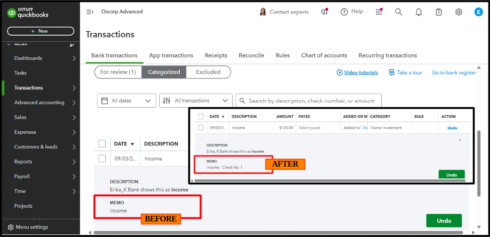 Buy nowWhile there isn't an option to directly edit the transactions from the Categorized tab, Filippo, I have an alternative solution to help make necessary modifications to your categorized transactions.