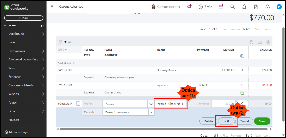 You can navigate to your Bank register to locate the transaction classified within the relevant bank account. From there, select the specific transaction and add the additional information in the Memo field directly or click the Edit button. For visual reference, I'll add a screenshot.