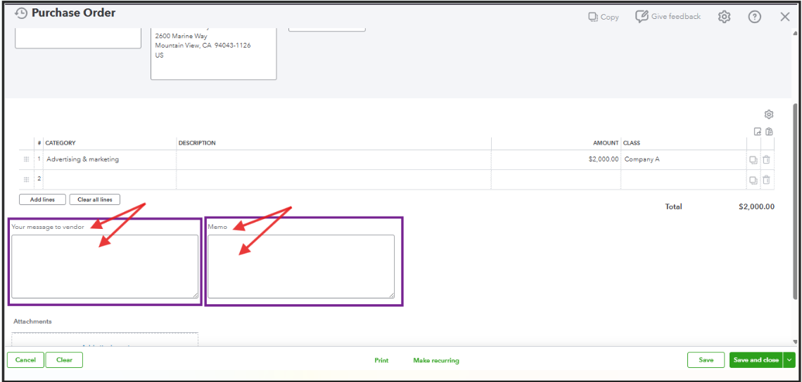 As an alternative, we can open the purchase order you need to update and make the necessary changes to reflect the additional work. After that, utilize Your Message to Vendor or the Memo field to provide details about the change order.