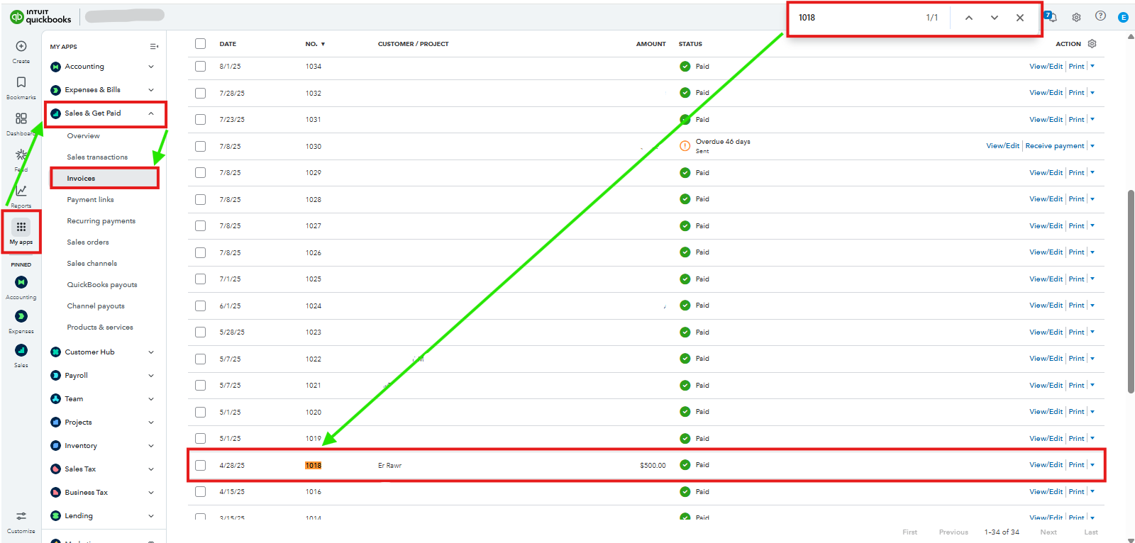 - From the Invoices tab, press CTRL + F on your keyboard.