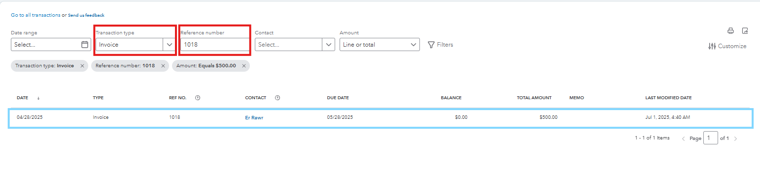 QBO has the flexibility to search for a specific transaction in the system. The fastest and most direct method is to click the Search icon and enter the amount. See the sample screenshot below.
