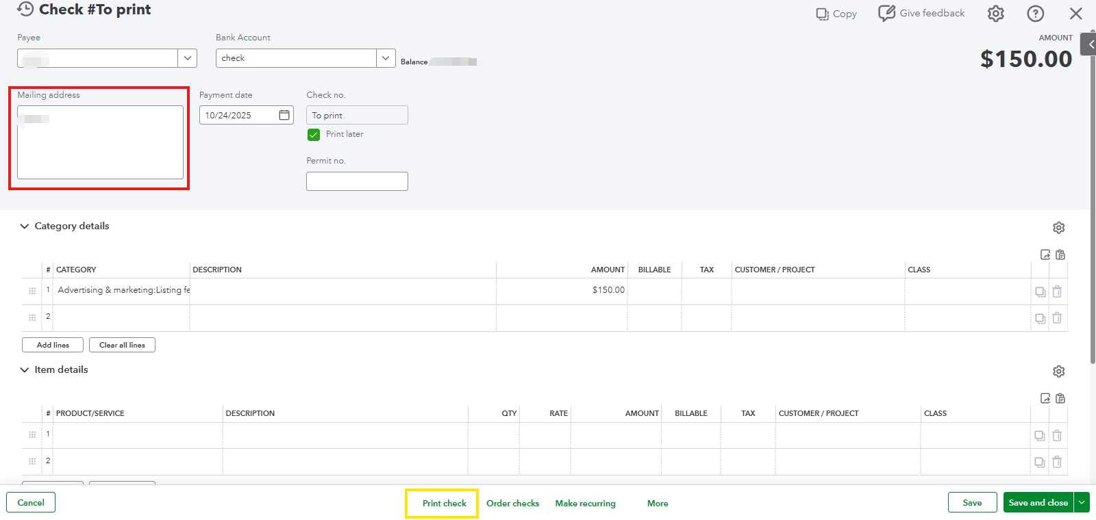 Before printing your check and sending it to your payee, please ensure that the Mailing address you input corresponds to the one with the TIN.