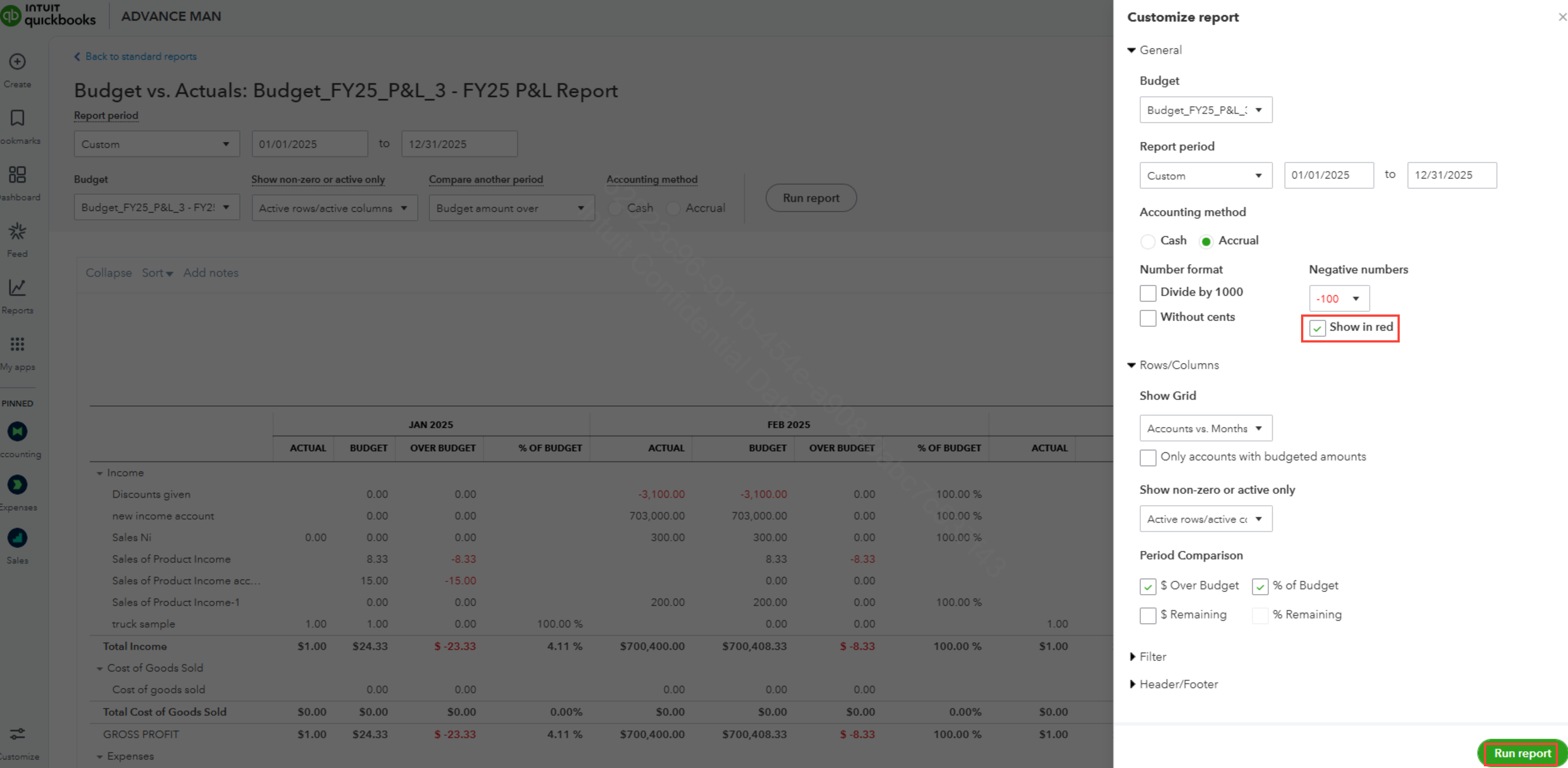 Yes, Doug. QuickBooks Online can display overbudget amounts as negative values and in red. This functionality requires enabling a specific setting in the Customize tab within the report.