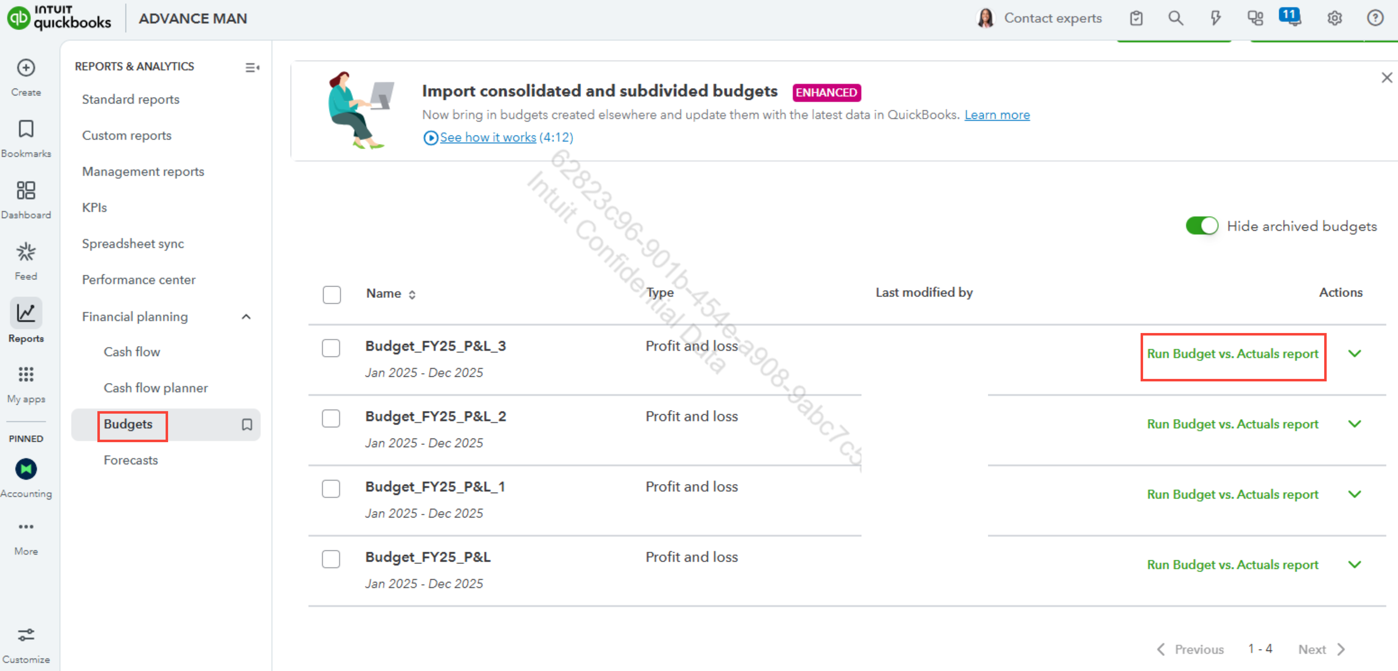 Additionally, you can automatically show overbudget amounts in red using the modern view. While still on the reports page, click on Budgets under Financial Planning and then select Run Budget vs. Actuals report.