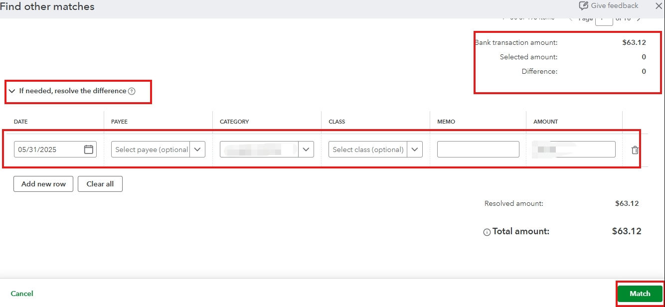 On the other hand, if it reflects the full payment amount (before fees are deducted), use the Resolve difference feature to account for the fees while matching the transaction. Here’s what to do:
