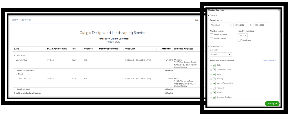 Moreover, to track your customer's transactions, you can run Transaction List by Customer report and add the Shipping Address column. See the sample screenshot below for reference: