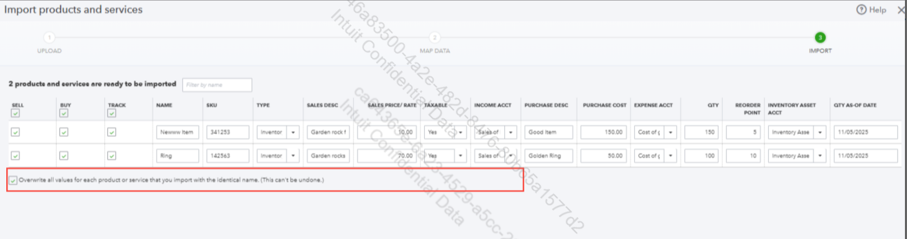 To ensure the program does not add or duplicate quantities, make sure to check the box labeled "Overwrite all values for each product or service that you import with the identical name." Additionally, ensure that the quantity in your file matches the quantity already in your account.