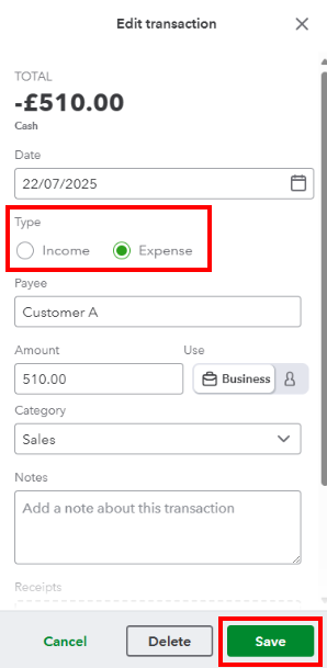 - Search for the amount to quickly locate it, or review each entry by clicking the pencil icon to verify if they have been categorized under the correct transaction type.
