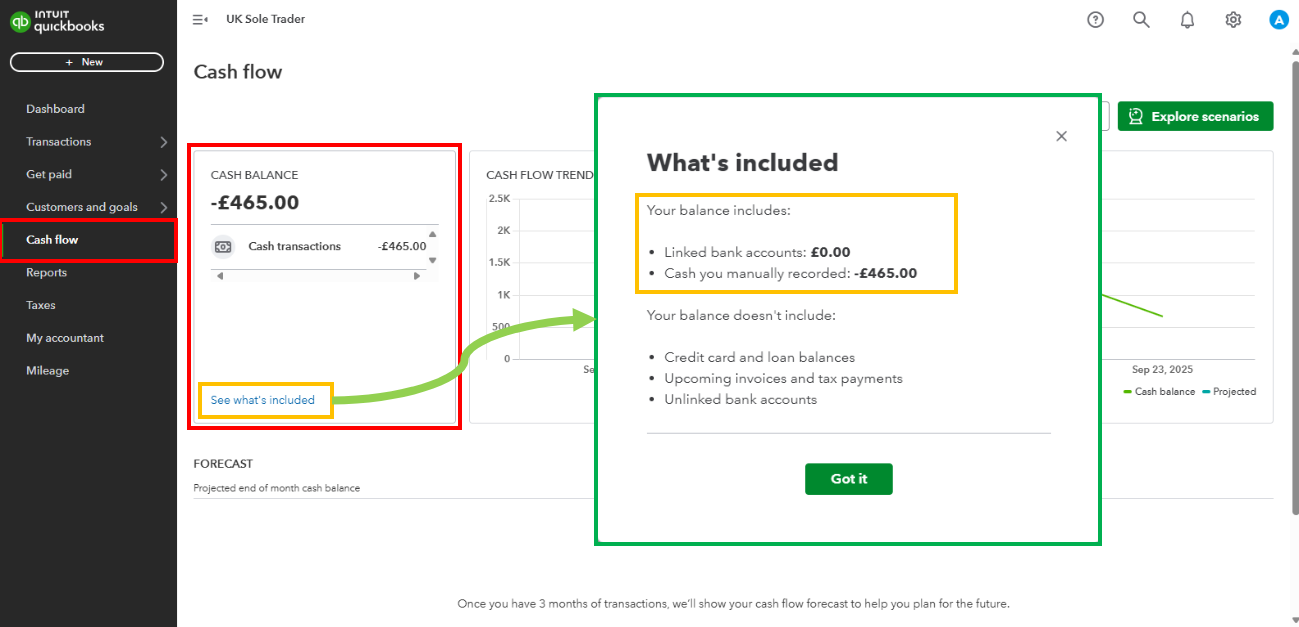 To determine where this amount is coming from, we can review your Cash Balance to see what’s included and identify any transactions or linked accounts that may be contributing to the unexpected figure. Here’s how: