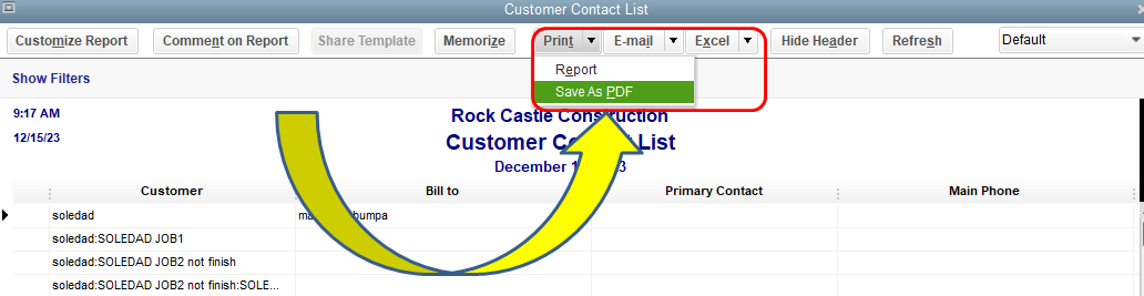 To do it, just go back to the report page in QuickBooks and click the Print drop-down at the top. Then, choose Save as PDF. See image below.