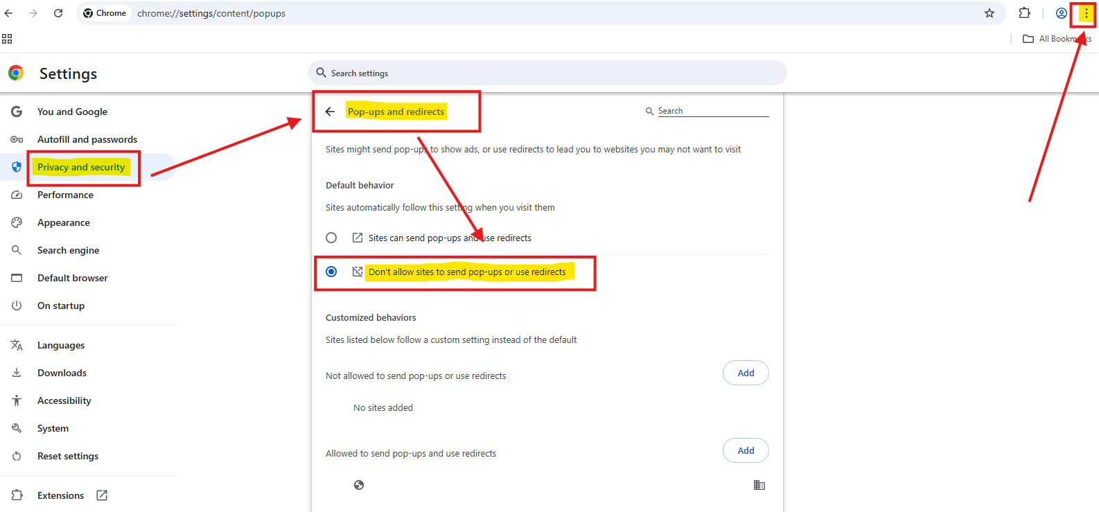 - Enable the Don’t allow sites to send pop-ups or use redirects option.