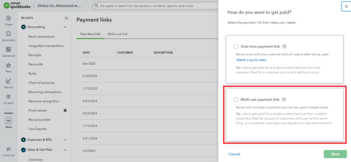 - Choose the Multi-use payment link option.
