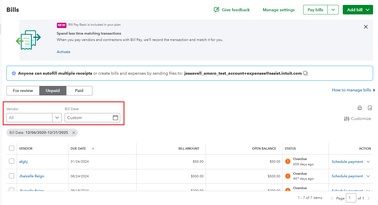 3. Filter the Vendor and customize the Bill Date filter to match the dates of the bills you want to delete.