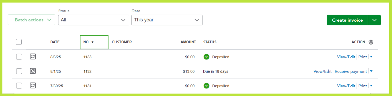 - Once completed, click the No. dropdown to display invoice numbers in descending order.