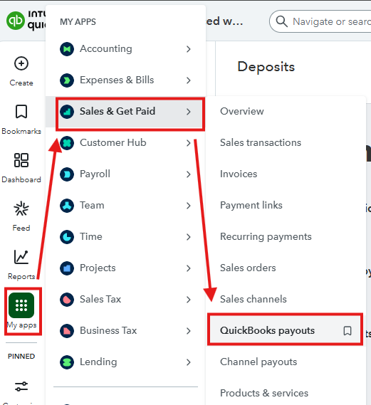 Payment deposits are now located in the QuickBooks payouts menu. You can bookmark the page for quicker access next time. You can refer to the screenshot below:
