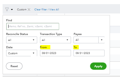- From the filter icon, customize the date. Select 08/01/2023 - 08/31/2023 from the fields.