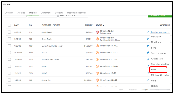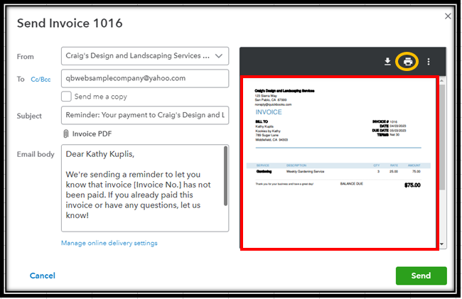 Also, the option to print out collection letters is unavailable in QuickBooks Online (QBO). You can only set up and send reminders instead to let your customers know their payments are due. And yes, you can print the invoice and manually create a collection letter. Refer to the screenshot below on how to print invoices.