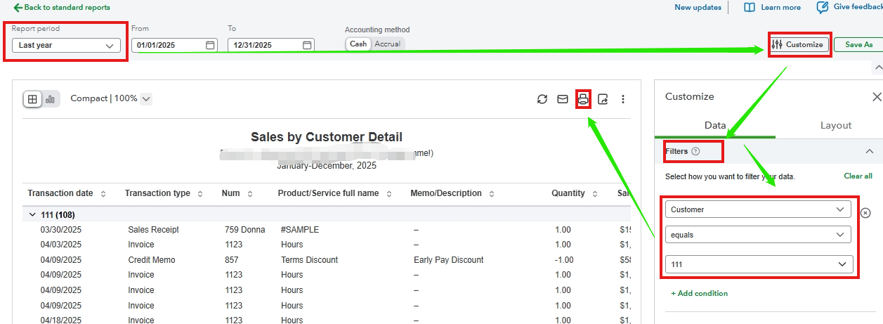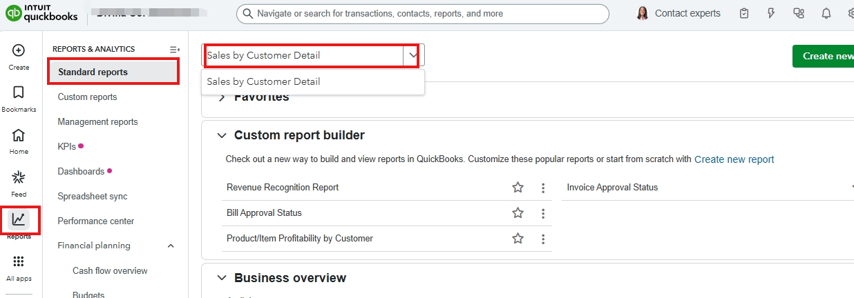 - Select Standard Reports and enter Sales by Customer Detail in the search dropdown menu.