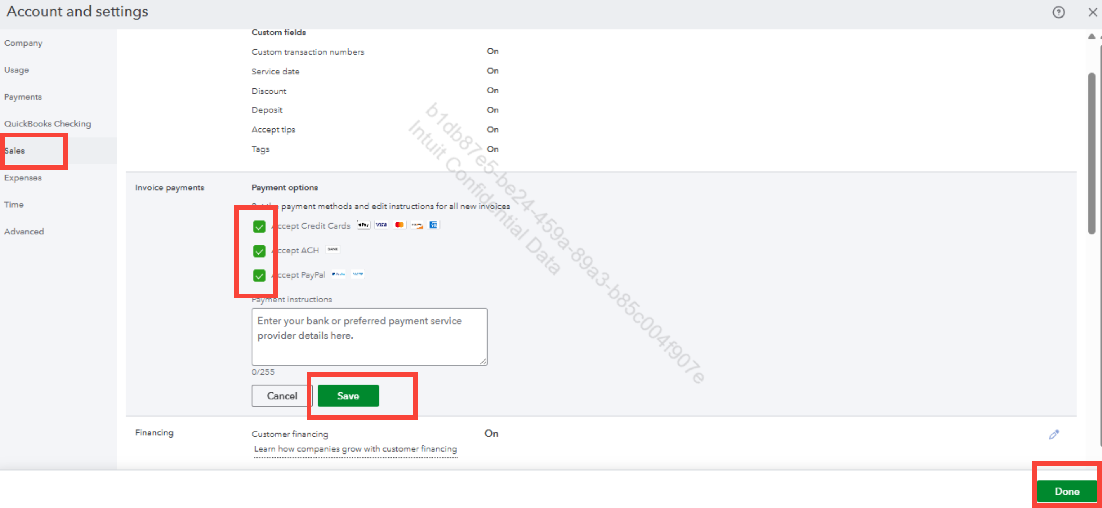 To remove the payment method from invoices already sent to customers, you can disable the payment method by unchecking the boxes for those payment options in the Account and settings section.