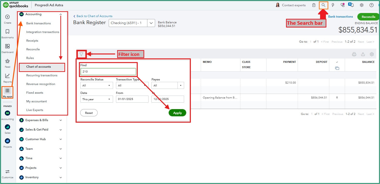 Another option is through the Chart of Accounts and view the account register. This allows you to filter the results and narrow down your search. Follow these steps:
