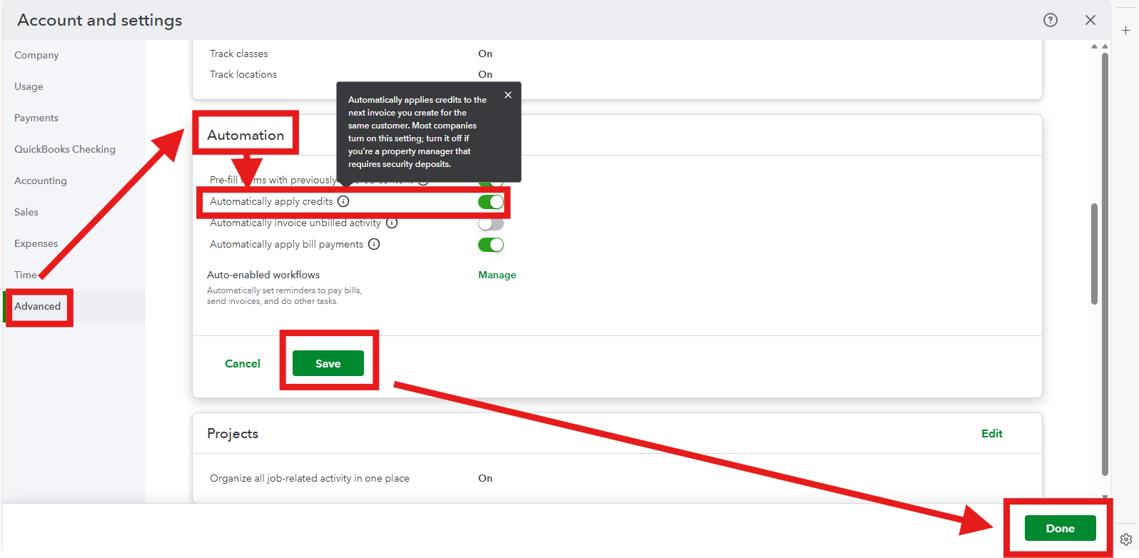 You can turn off the automation feature for applying credits to the invoices from your Accounts and settings.. Here's how:
