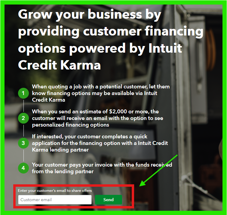 Currently, this options only available for estimates over $1,000 sent to customers through QuickBooks Online. However, this option is not yet available for invoices sent via QuickBooks, as it can take several days for financing funds to be received by the customer or the borrower.