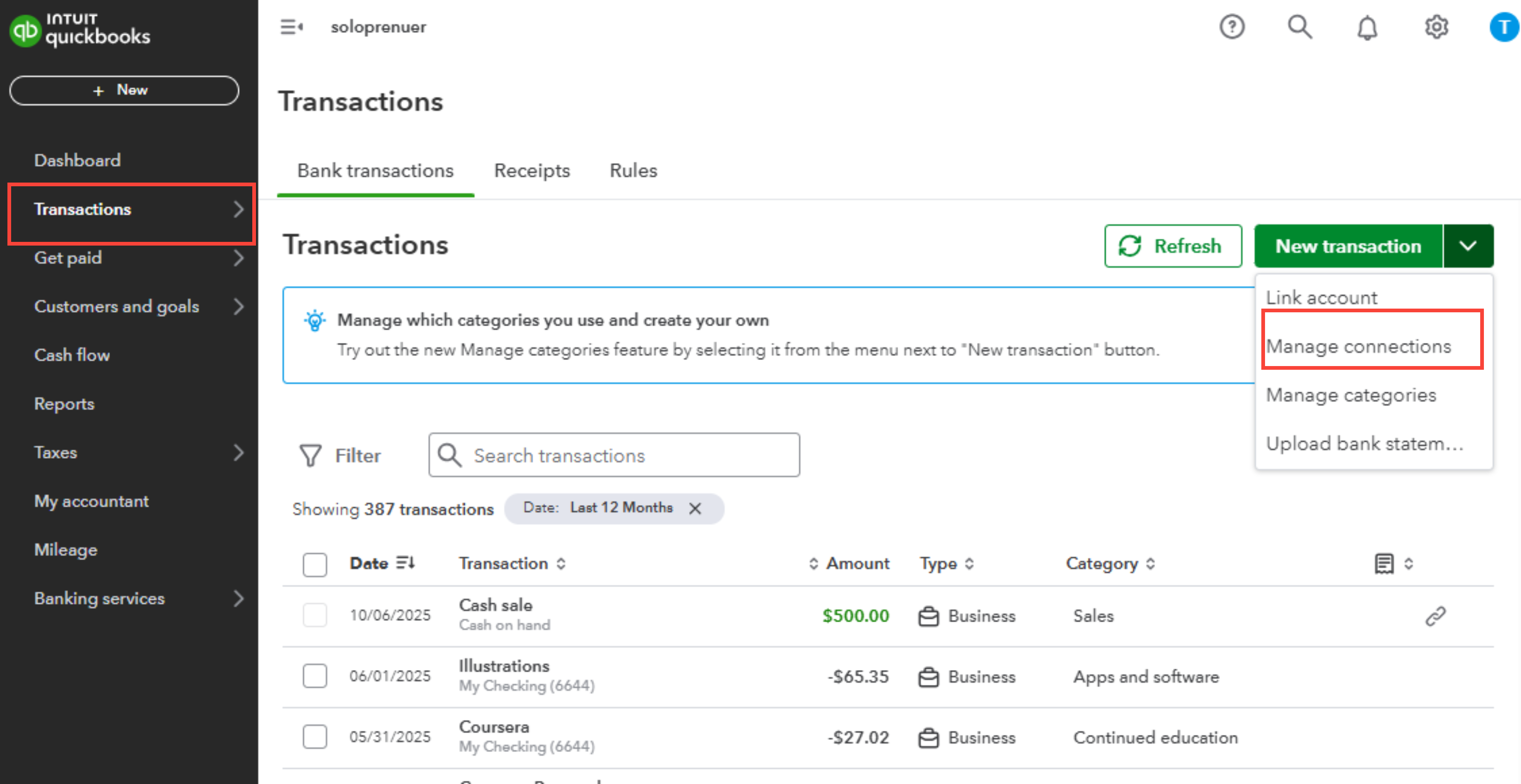 - Select Bank Transactions. In the New Transaction dropdown, click Manage Connection.