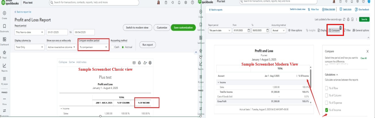 - In the modern view, click the Compare icon and select % of Income. While in the Classic view, click Compare another period dropdown and choose the percentage of income/sales to achieve the same result.