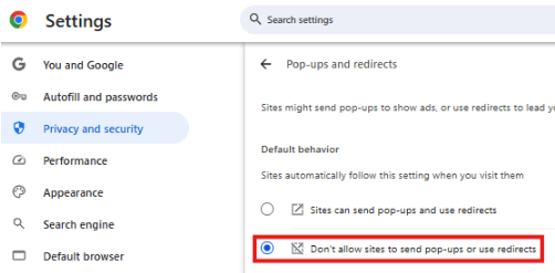 - Tick the Don't allow sites to send pop-ups or use redirects option.
