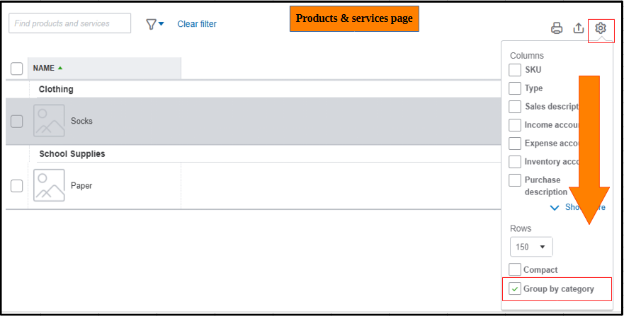 If you’re working on the Products & services page, QuickBooks doesn't have a separate category column for your categories. Instead, you can organize them to appear as bold header rows. Just click the small Gear icon right above your list and check the Group by Category box.