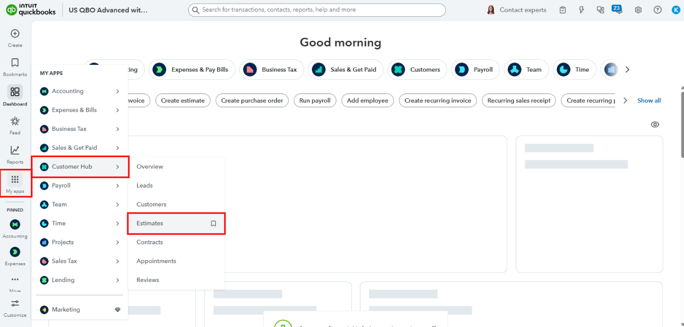 - Go to My Apps, then Customer Hub, and choose Estimates.