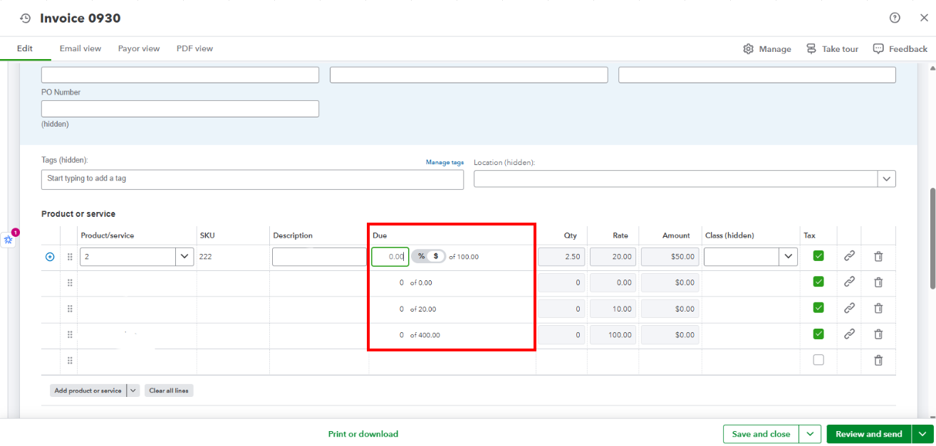 Although QuickBooks does not support partial invoicing by quantity, you can use the Manual Entry for Each Line option and enter the following calculation in the Due column: (Quantity × Rate per Item). This way, the application will calculate the amount for the quantity of the item you are invoicing.