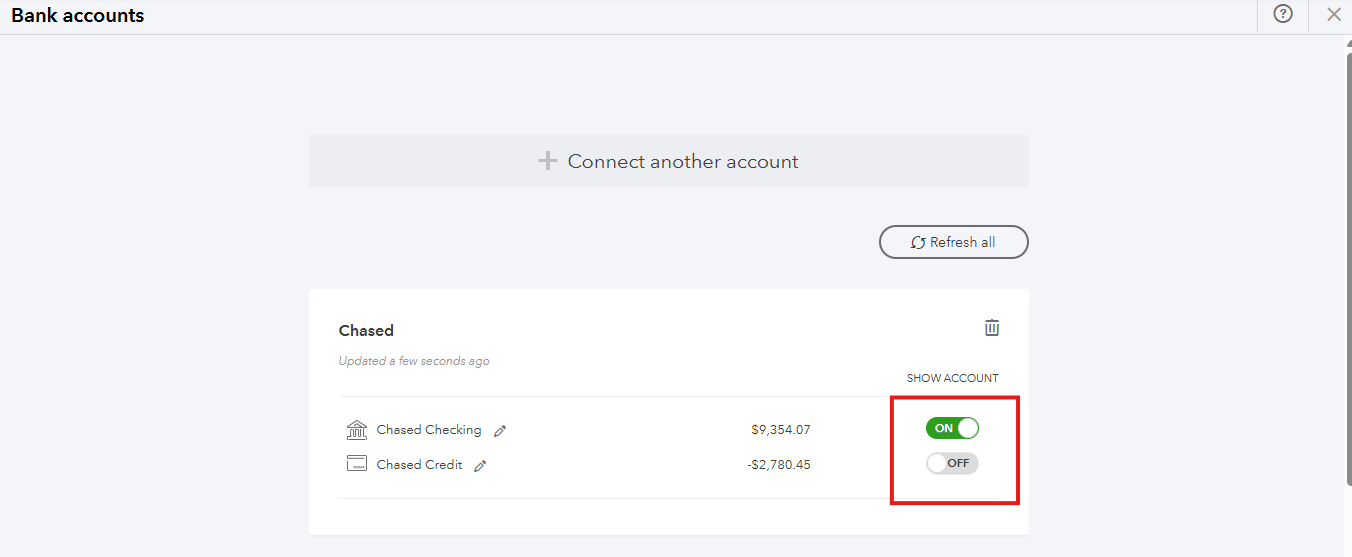 In the meantime, it’s possible that the connected Chase Bank account is hidden, especially since the system indicates the account is already linked. While the account remains connected, its transactions are hidden from the Transactions page. Here's how you can make them reappear: