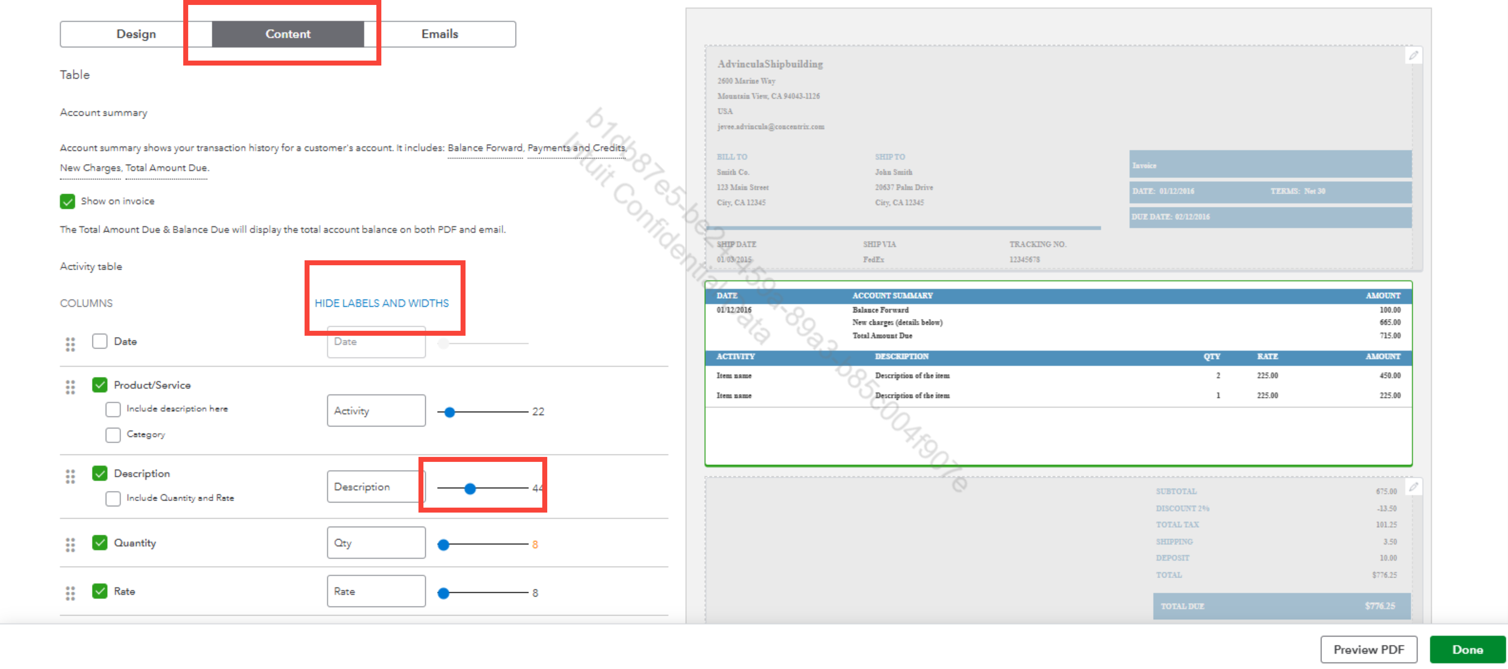 - If you need more space, you can uncheck the box of Quantity and Rate to make further room for the Description field.