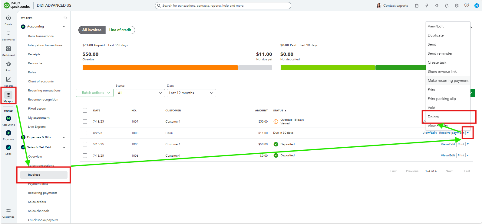 To add the billable expense, we need to delete the current invoice and recreate it. Before deleting the invoice, ensure that you copy or note down all its details so that you can recreate it accurately.