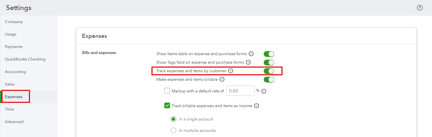 Once you're all set up and ready, let's enable the Track expenses and items by customer option. Here's how: