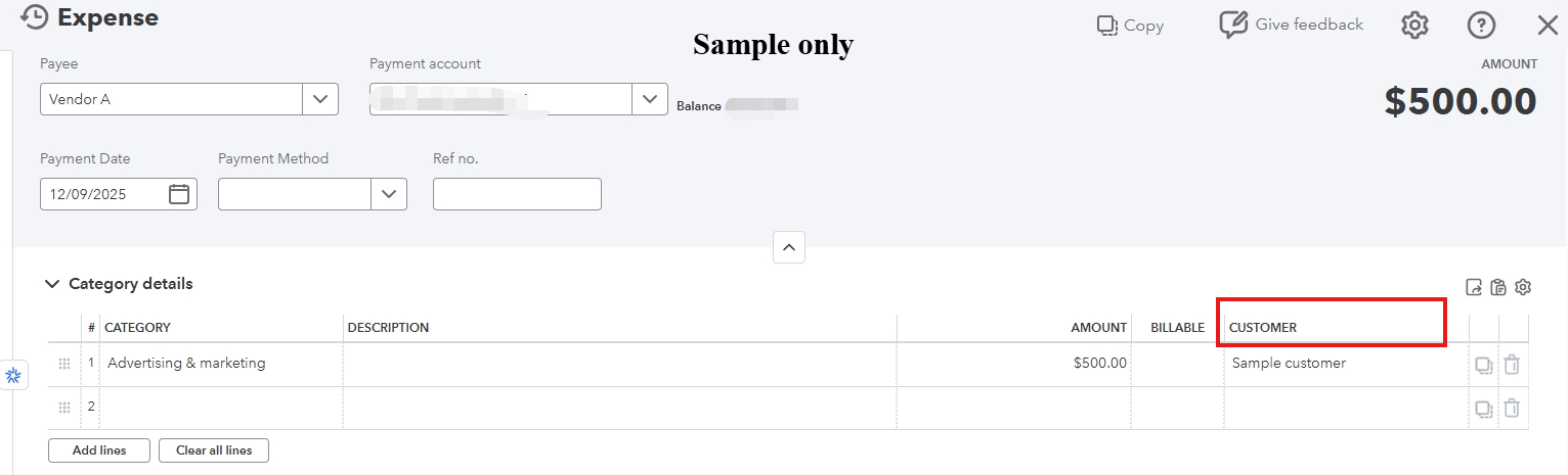 After that, you'll see the Customer column when creating an expense transaction. Here's a visual reference:
