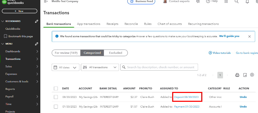 Correcting the categorization of bank deposit and Zelle payment transactions is easy, and I'll be happy to walk you through it.