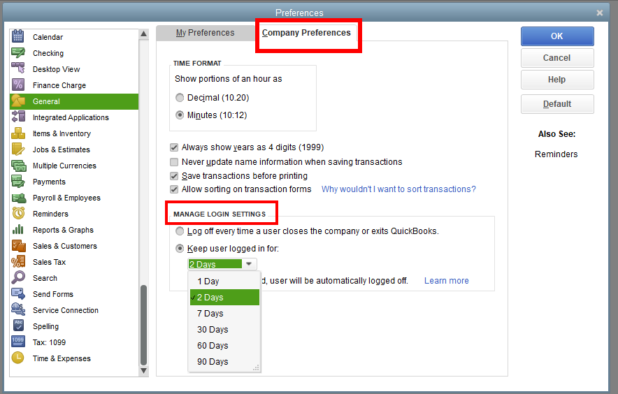 To choose how long you can remain logged in (maximum of 90 days), change your user settings. Ensure you access your company file as the admin user to make these changes.